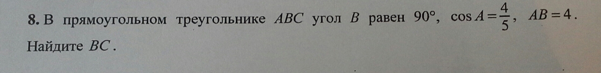cosA=AB/AC (косинус угла в прямоугольном треугольнике равен отношению прилежащего катета к гипотенузе)=4/5⇒AC=5
