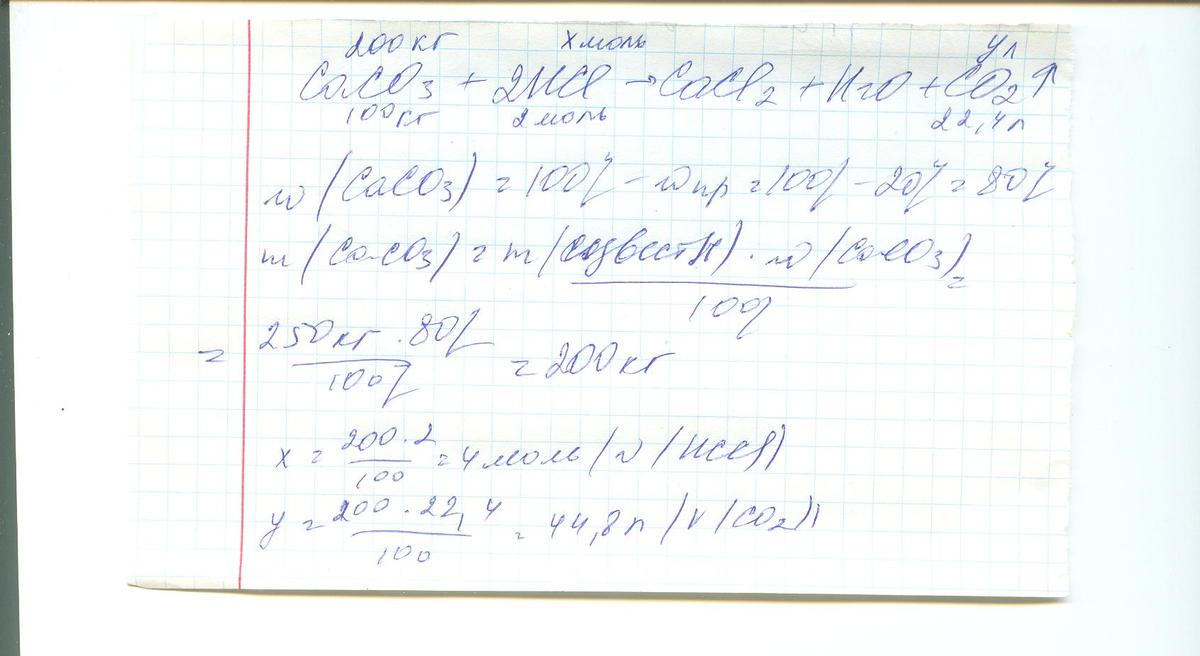 Какой обьем углекислого газа (CO2) образуется при взаимодействии 250кг известняка (CaCO3), содержащего 20% примесей с азотной кислотой (HNO3), определить количество израсходованной кислоты (моль)