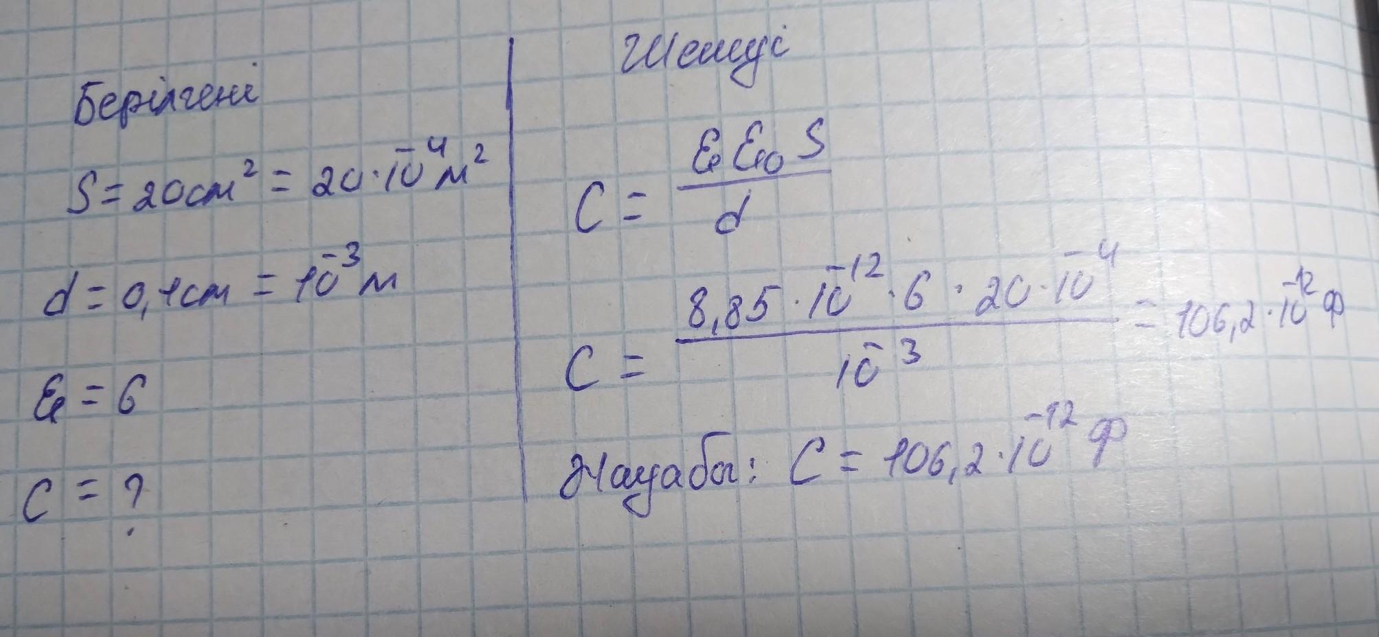 Жазык конденсатордын ауданы 20 см', диаметрі 0,1 см, диэлектрлік отімділігі 6-га тен болган жадайда конденсатордын сыймдылығын аныктаныз (є0=8.85*10-12 Кл?/Н*м°)