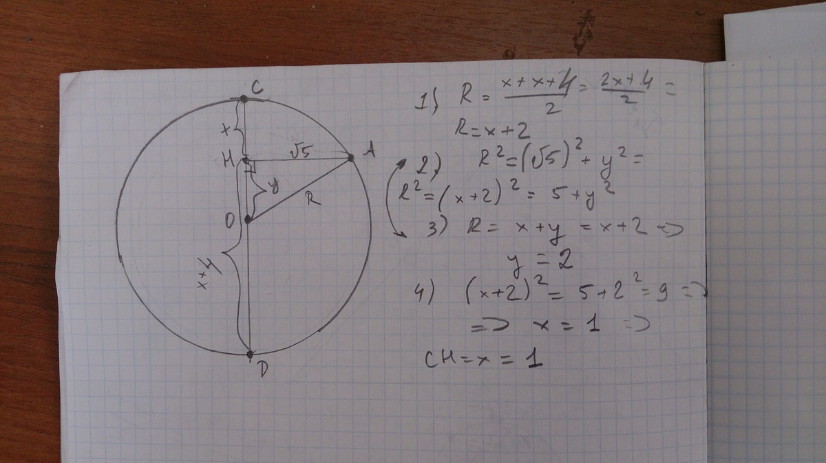 Из точки А окружности проведен перпендикуляр АН к диаметру СD.отрезок СН на 4 см меньше отрезка НD. АH=√5. СН=?