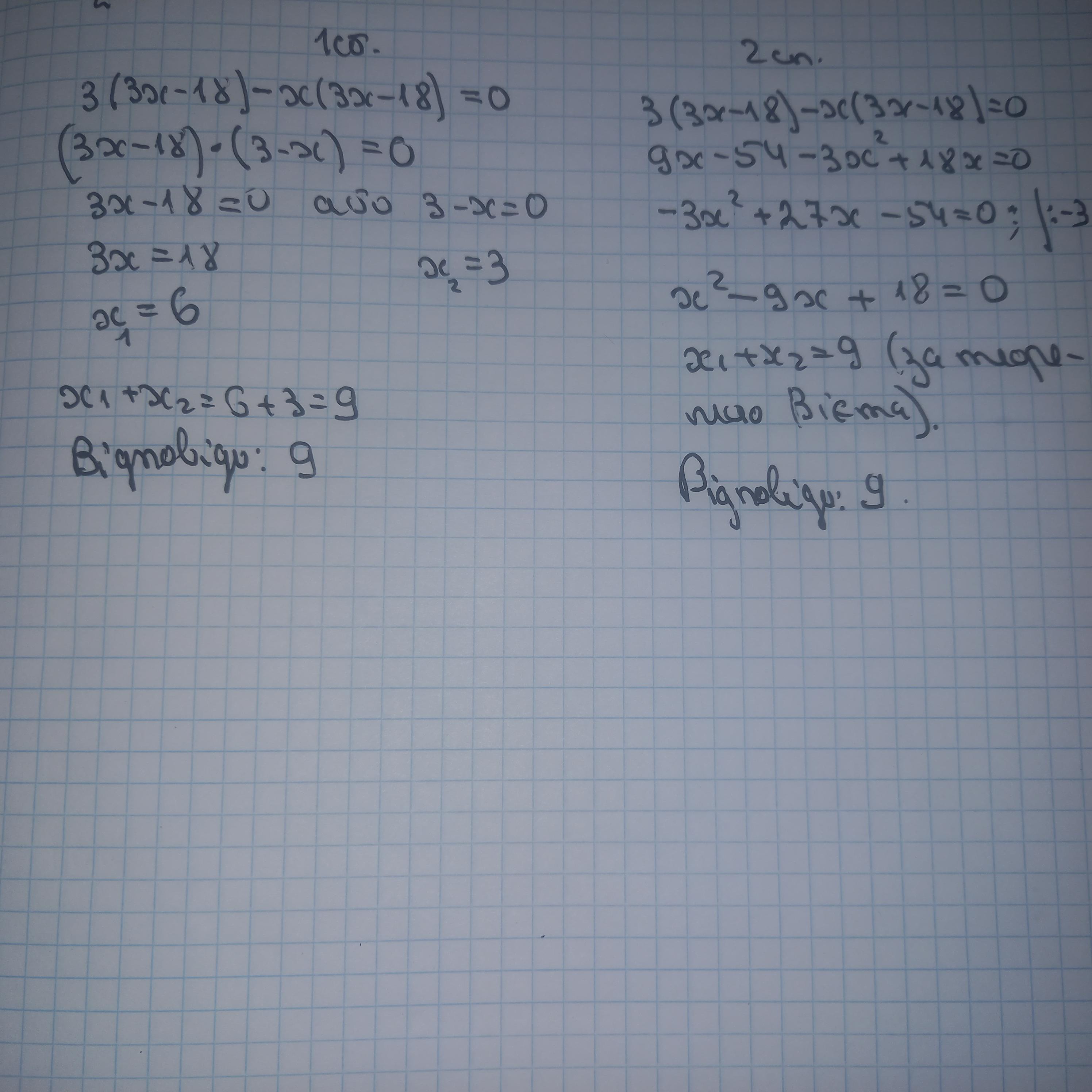 Розв’яжи рівняння 3(3х – 18) – х(3х – 18) = 0 (у відповідь запиши суму його коренів) ще розв'язання