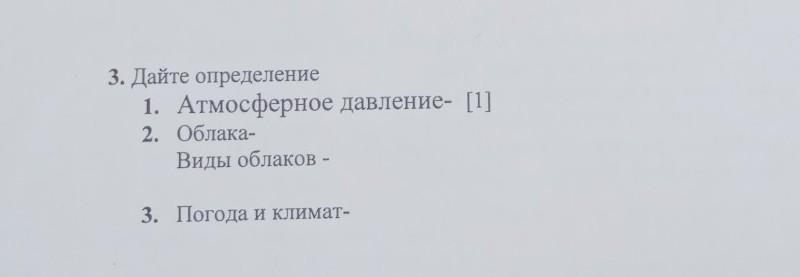 3. Дайте определение 1. Атмосферное давление- [1] 2. Облака- Виды облаков - 3. Погода и климат-