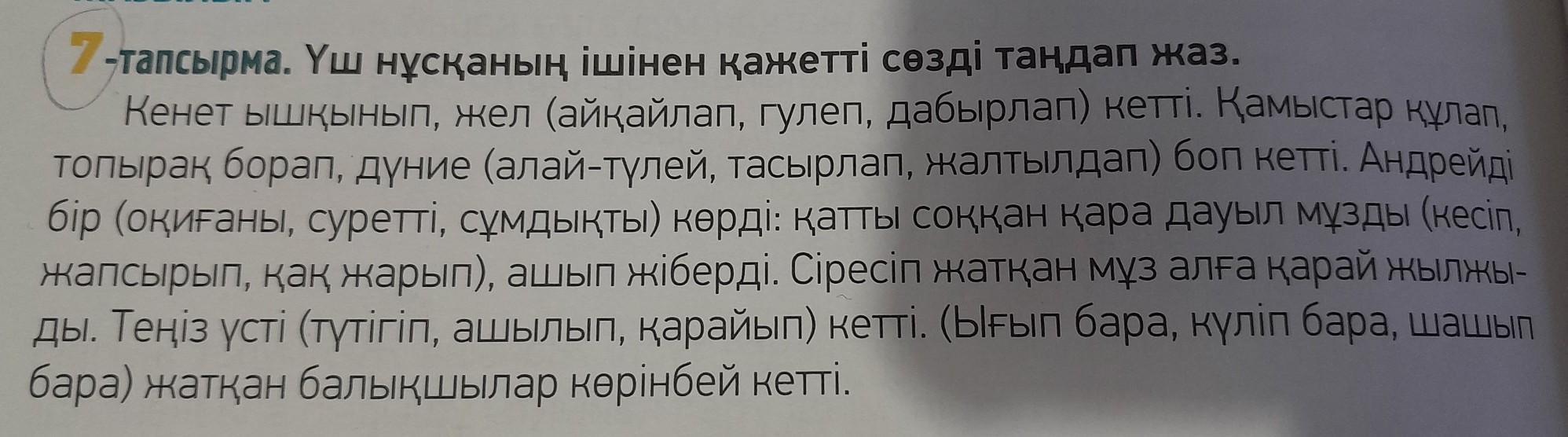 ЖАЗЫЛЫМ 7-тапсырма. Уш нұсқаның ішінен қажетті сөзді таңдап жаз. Кенет ышқынып, жел (айкайлап, гулеп, дабырлап) кетті. Камыстар кулап, топырак борап, дүние (алай-түлей, тасырлап, жалтылдап) боп кетті. Андрейді бір (оқиғаны, суретті, сұмдықты) керді: қатты соққан қара дауыл мұзды (кесiп, жапсырып, қақ жарып), ашып жіберді. Сіресіп жатқан мұз алға қарай жылжы- ды. Теңiз үсті (түтігіп, ашылып, карайып) кетті. (Ығып бара, күлiп бара, шашып бара) жатқан балықшылар көрінбей кетті. МӘТІНСОҢЫ ЖҰМЫС