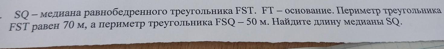 5. SQ-медиана равнобедренного треугольника FST. FT - основание. Периметр треугольн FST равен 70 м, а периметр треугольника FSQ - 50 м. Найдите длину медианы SQ.
