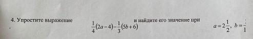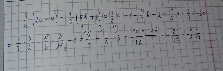 1/4(2а - 4) - 1/3(5в + 6) = 2/4а - 4/4 - 5/3в - 6/3 =