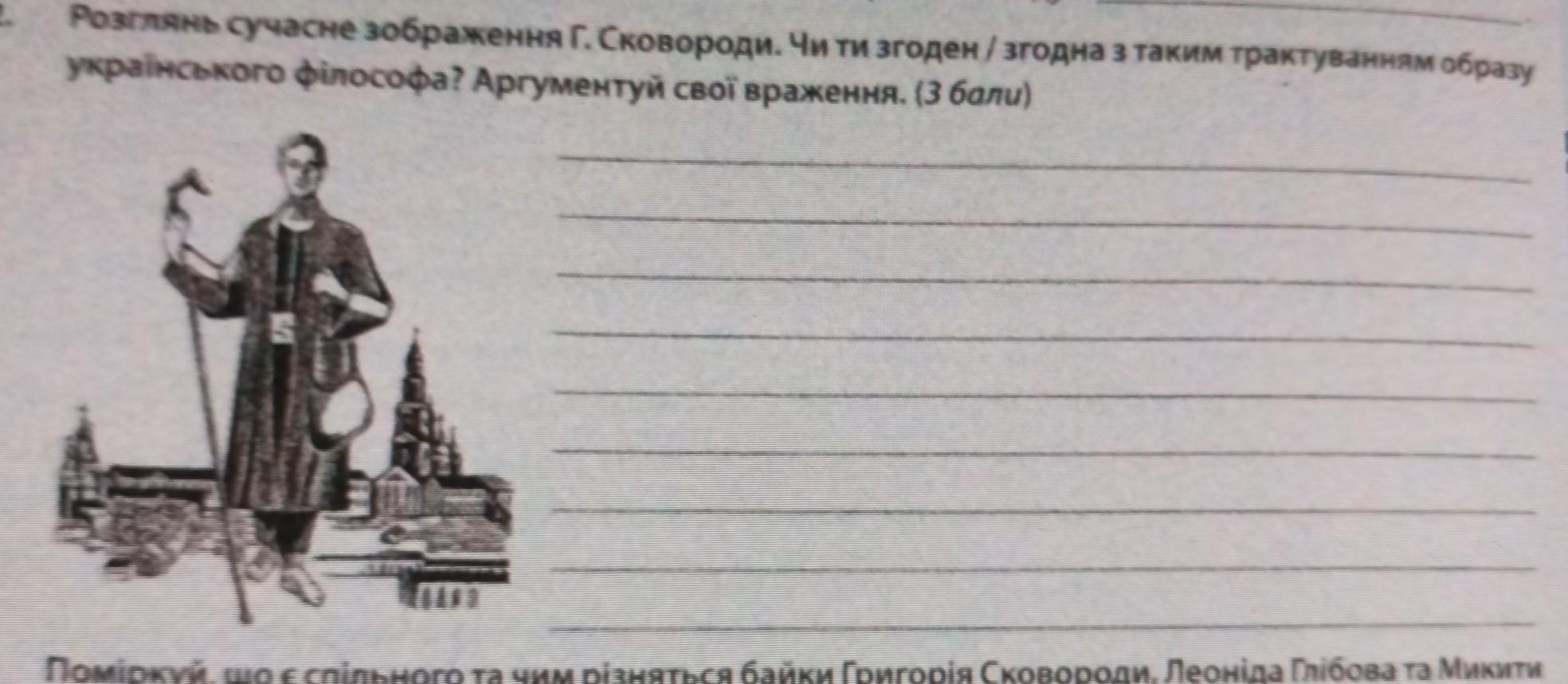 Розглянь сучасне зображення Г. Сковороди. Чи ти згоден/згодна з таким трактуванням образу українського філософа, Аргументуй своï враження. (10 бали)
