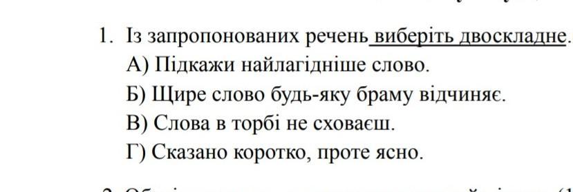 Пунктуація 1. Із запропонованих речень виберіть двоскладне А) Підкажи найлагідніше слово. Б) Щире слово будь-яку браму відчиняє. В) Слова в торбі не сховаєш. Г) Сказано коротко, проте ясно.