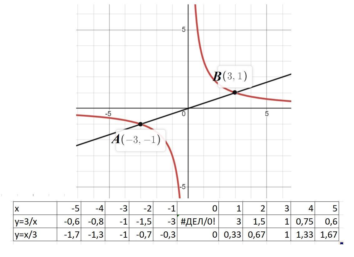 Строим графики функций y=x/3; y=3/x (См. скриншот)