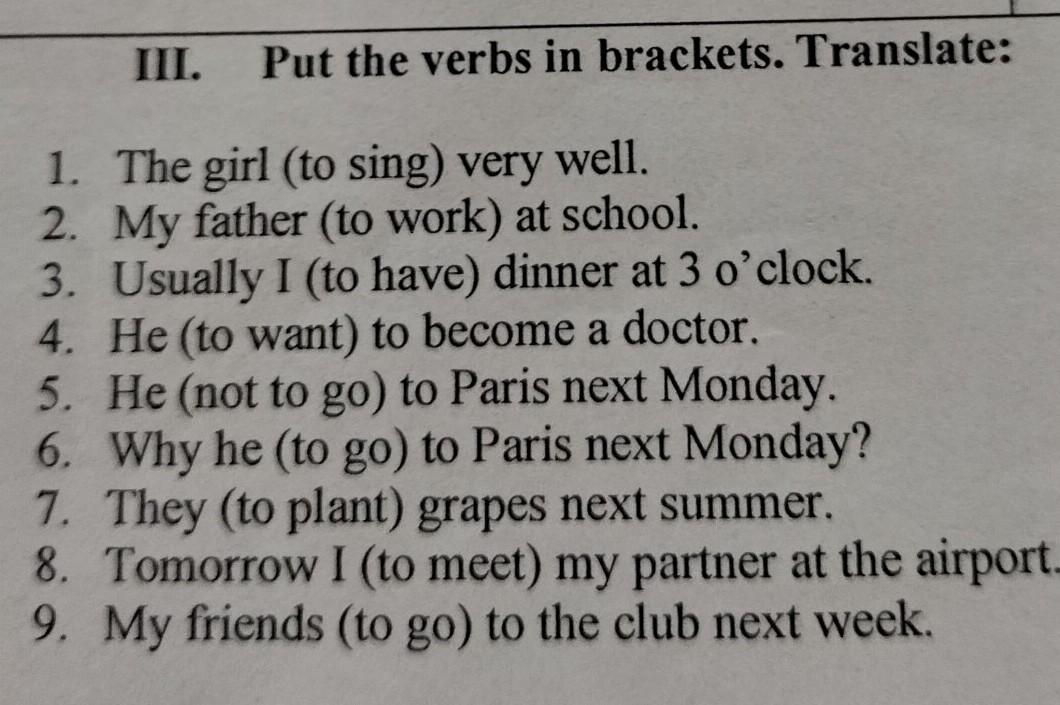 III. Put the verbs in brackets. Translate: 1. The girl (to sing) very well. 2. My father (to work) at school. 3. Usually I (to have) dinner at 3 o'clock. 4. He (to want) to become a doctor. 5. 6. He (not to go) to Paris next Monday. Why he (to go) to Paris next Monday? They (to plant) grapes next summer. 8. Tomorrow I (to meet) my partner at the airport. 9. My friends (to go) to the club next week. 7.