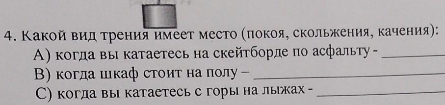4. Какой вид трения имеет место (покоя, скольжения, качения): А) когда вы катаетесь на скейтборде по асфальту - В) когда шкаф стоит на полу- C) когда вы катаетесь с горы на лыжах - [3] СРОЧНО