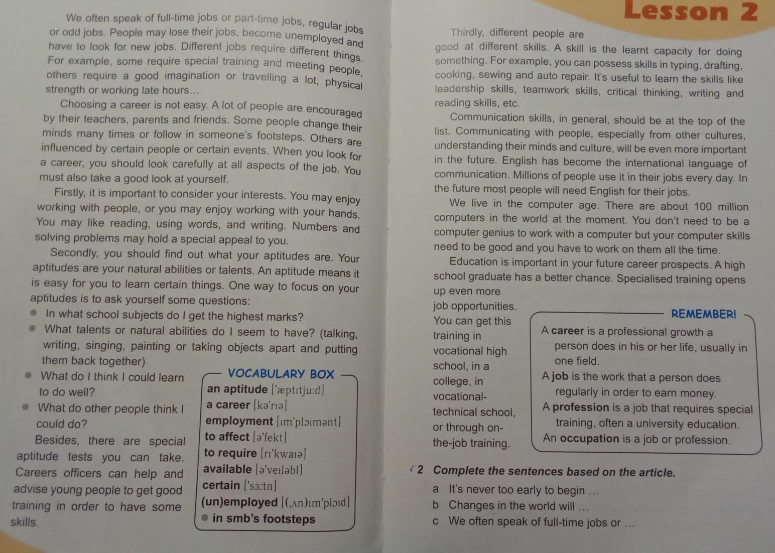 Зробіть каротке есе 2 --2.5 страниц дам 100 балов VOCABULARY questions. 1 Read the article and be ready to answer the following What idea has become old-fashioned? Where will many people work in the future? Which skills have become very important? One of the most important decisions in the life of every person is to choose the right career or occupation. With hundreds jobs to choose from, it's never too early to begin thinking about your future career. As a teenager today, you can expect to work for approximately 40 years. During this time, you may have several jobs. Changes in the world will affect the jobs available. The idea of a job for life' has already become old-fashioned. In the future most people will work for several companies instead of just for one. A lot of people already work from home, connected to the Internet, and there will be many more in the years to come.
