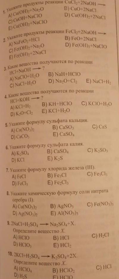 1. Укажите продукты реакции CuCl2+2NaOH - A) Cu(OH)2+Na2O CuOH+NACIO C) E) Cu(OH)₂+NaCIO 2. Укажите продукты реакции FeCl2+2NaOH - A) NaFeO₂+HCI c) Fe(OH)2+Na2O E) Fe(OH)₂+2NaCI 3. Какие вещества получаются по реакцин HCl-NaOH? A) NaCIO+H₂O C) NaCl+H₂O A) KCI+H₂ D) K-O+Cl2 B) CuO+2NaCl D) Cu(OH)2+2NaCl A) Ca(NO3)2 D) CaCO3 B) FeO+2NaCl D) Fe(OH)3+NaCIO 4. Какие вещества получаются по реакции HCI-KOH-? 6. Укажите формулу A) K₂SO4 D) KCI B) NaH+HCIO D) Na2O+Cl2 В) КН+НСІО c) КСЮO+H2O Е) КCI+H-0 5. Укажите формулу сульфата кальция. B) CaSO3 E) CaSO4 сульфата калия. B) CaSO4 E) K₂S E) NaCl+H₂ 11. 2NaCl+H2SO4 Operato 7. Укажите формулу хлорида железа (III). B) Fe:Cl A) FeCl D) FeCl3 E) Fe₂C13 9. 2NaCl+H2SO4 ->Na2SO4+X. Определите вещество Х. A) HCIO B) HCI D) HCIO, E) HCl, 10. 2KCl+H2SO4 -> K,SO4+2x Определите вещество Х. A) HClO4 D) H₂S C) CaS 8. Укажите химическую формулу соли нитрата серебра (1). B) НСl2 E) HCIO - Na2SO4 + 2X C) K₂SO₂ A) Cu(NO3)2 B) AgNO3 C) Fe(NO3)3 D) Ag(NO3)2 E) Al(NO3)3 C) Fe Cly C) H-CI C) HCI