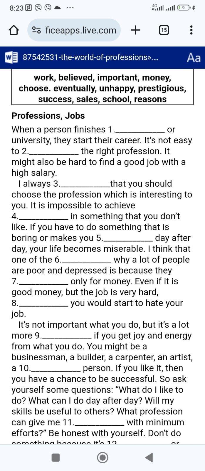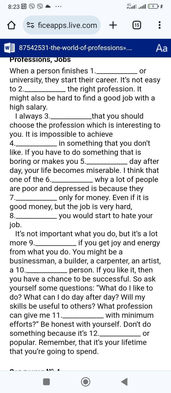 When a person finishes 1. school or university, they start their career. It's not easy to 2. choose the right profession. It might also be hard to find a good job with a high salary.