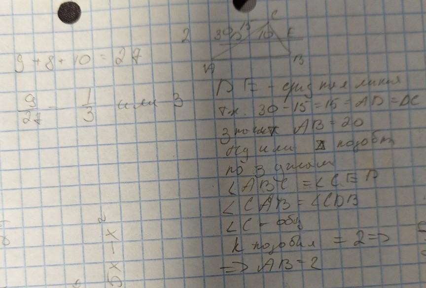 4. Стороны треугольника равны 8 м, 9 м и 10 м, а периметр подобного ему треугольника равен 9 м. Найдите коэффициент подобия треугольников. [2] 5. В треугольнике ABC проведен отрезок DE параллельно стороне АВ. Найдите AB, если DE=10 см, АС = 30 см, CD = 15 см. [3] E