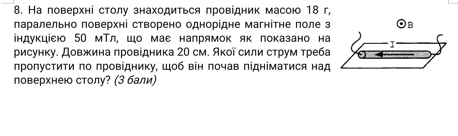 На поверхні столу знаходиться провідник масою 18 г, паралельно поверхні створено однорідне магнітне поле з індукцією 50 мТл, що має напрямок як показано на рисунку. Довжина провідника 20 см. Якої сили струм треба пропустити по провіднику, щоб він почав підніматися над поверхнею столу?