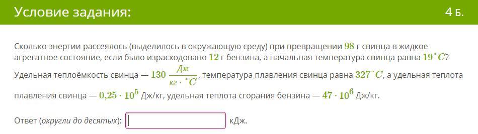 Ответ:Для решения данной задачи посчитаем сначала количество теплоты, выделившейся при превращении 98 г свинца в жидкое агрегатное состояние.