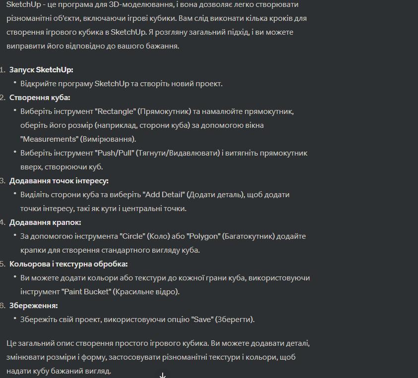 Це загальний опис створення простого ігрового кубика. Ви можете додавати деталі, змінювати розміри і форму, застосовувати різноманітні текстури і кольори, щоб надати кубу бажаний вигляд.