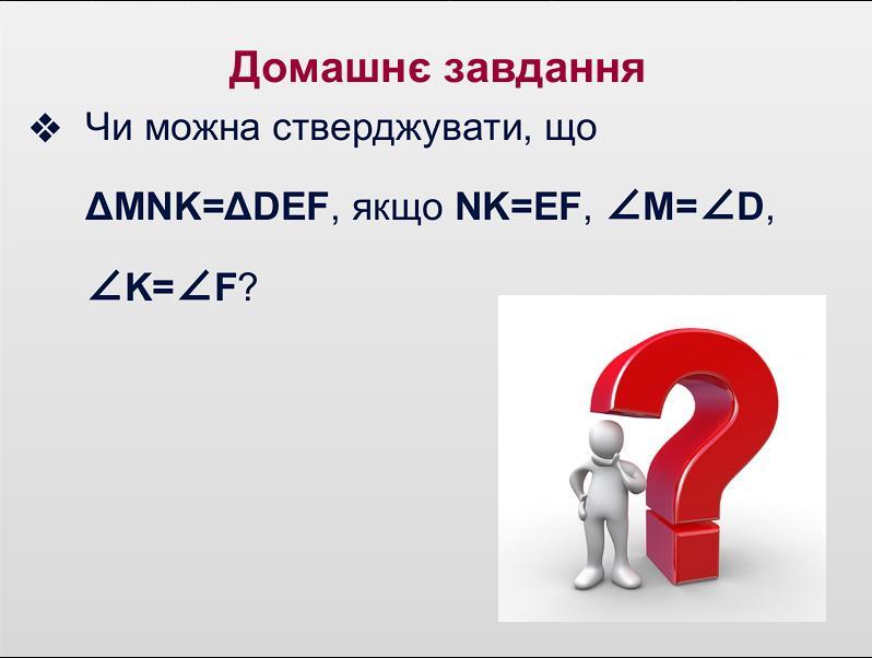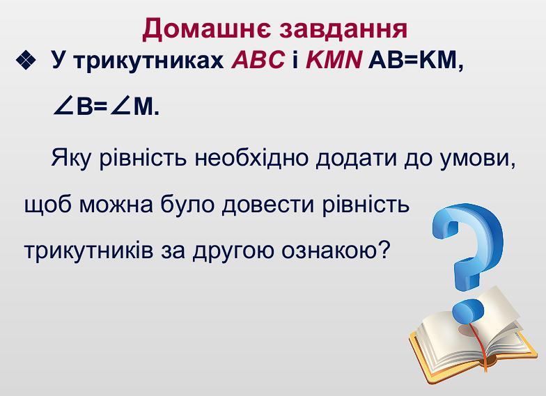 перше питання: треба додати рівність кут А = куту К Бо друга ознака рівності трикутників: за стороною і прилеглими до неї кутами.