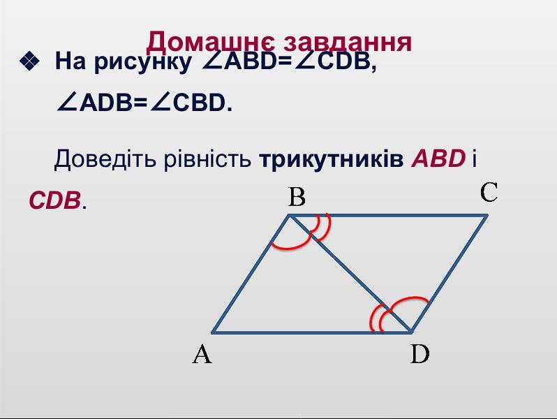 третє питання: розглянемо трикутники АВD i CDB. У них сторона ВD спільна, а ABD=CDB i ADB=CBD за умовою. Отже, трикутники ABD i CDB рівніз за другою ознакою.