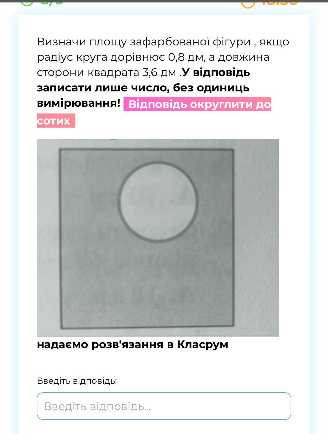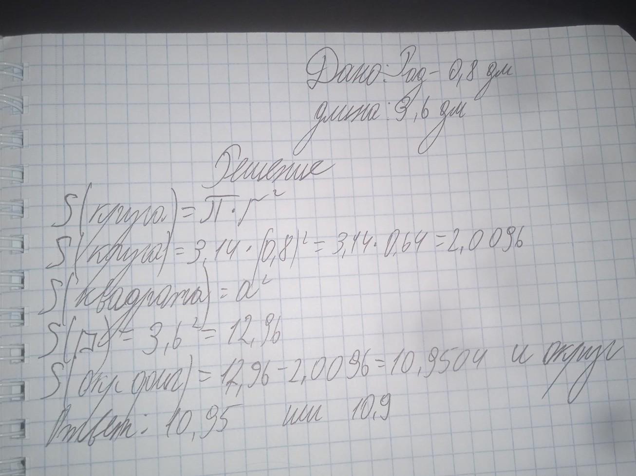 Визначити площу зафарбованої фігури, якщо радіус круга дорівнює 0,8 дм, а довжина сторони квадрата 3,6 дм. У відповідь записати лише число, без одиниць вимірювання! ВІДПОВІДЬ ОКРУГЛИТИ ДО СОТИХ