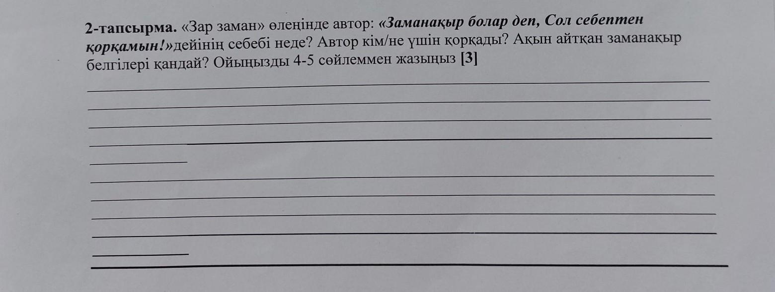 2-тапсырма. "Зар заман" өлеңінде автор: "Заманақыр болар деп, Сол себептен қорқамын!"деуінің себебі неде? Автор кім/не үшін қорқады? Ақын айтқан заманақыр белгілері қандай? Ойыңызды 4-5 сөйлеммен жазыңыз.