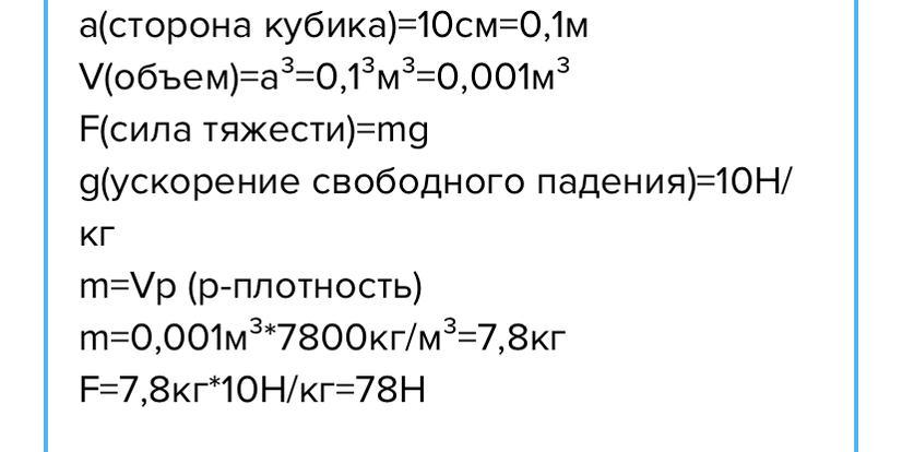 Сила тяжести на кубике из льда определяется формулой \( F = m \cdot g \), где \( m \) - масса кубика, а \( g \) - ускорение свободного падения (приблизительно 9.8 м/с² на Земле). Масса кубика можно найти, умножив его объем на плотность воды.