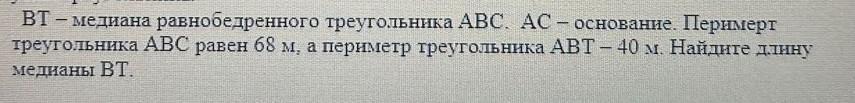 6. ВТ - медиана равнобедренного треугольника АВС. АС - основание. Перимерт треугольника АВС равен 68 м, а периметр треугольника АВТ-40 м. Найдите длину медианы ВТ.
