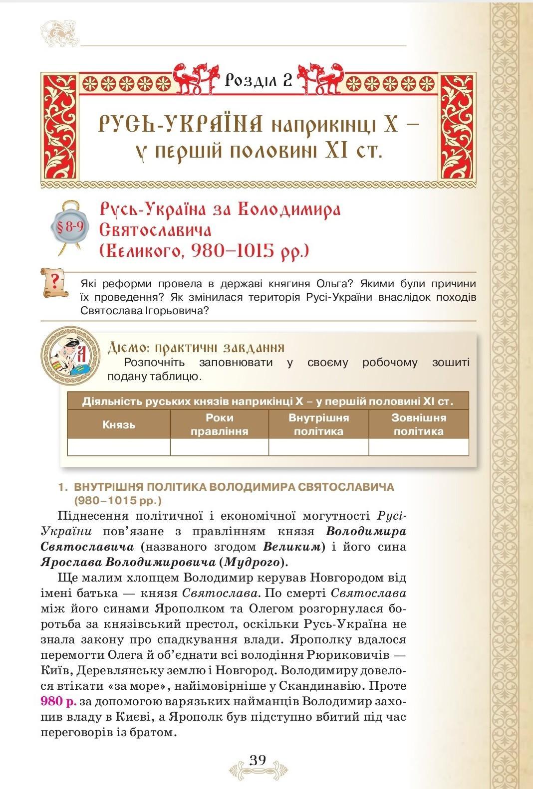 Здійснив релігійну, адміністративну й військову реформи. Розпочав карбування власних монет. Розбудовував Київ, заснував нові міста, збудував Десятинну церкву (996). Для захисту від кочовиків звів систему земляних валів. Встановив Київську митрополію Константинопольського патріархату. Запровадивши в 988 році християнство, зміцнив владу в державі та міжнародний авторитет Русі-України, сприяв розвитку культури.