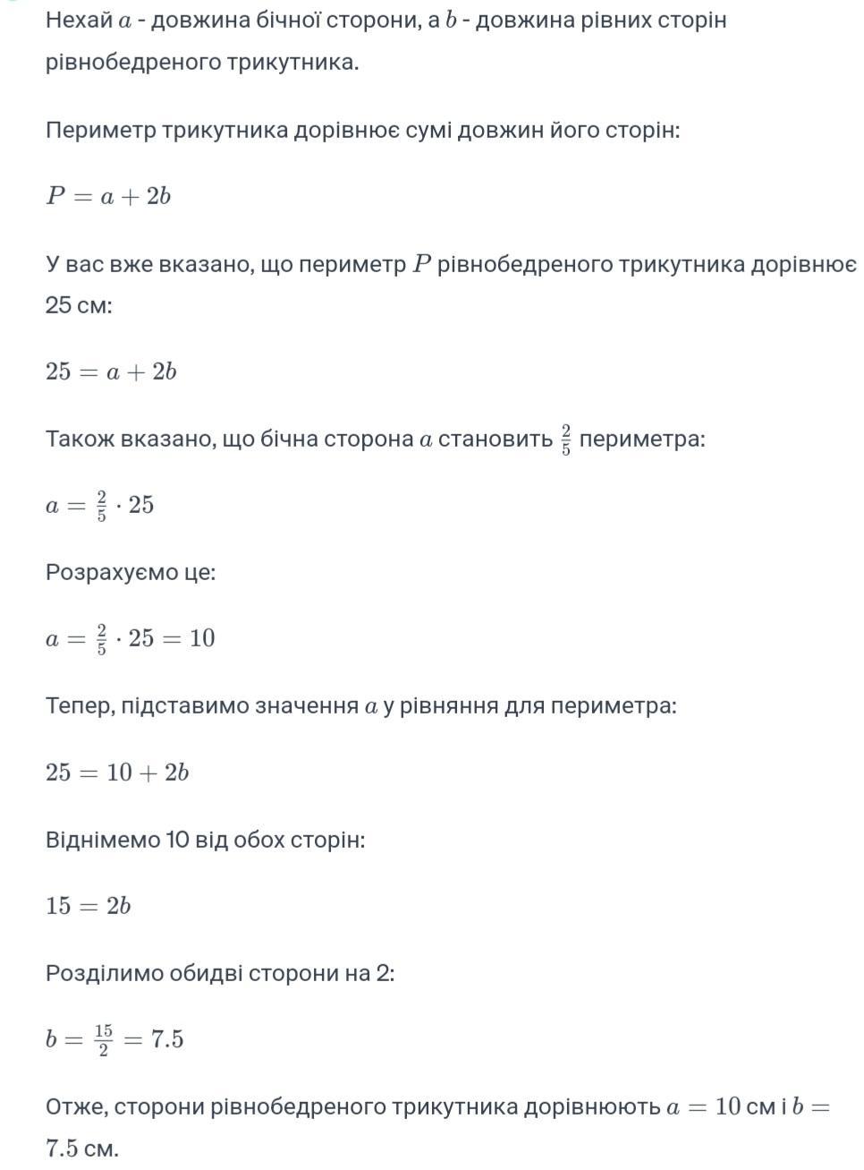 Периметр рівнобедреного трикутника 25 см. Знайди сторони трикутника, якщо бічна