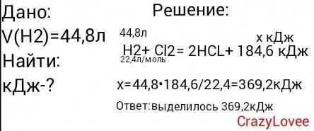 Найдите количество теплоты, выделившееся при взаимодействии 44,8 л водорода с хлором. H2+Cl2 = HCl + 184,6 кДж