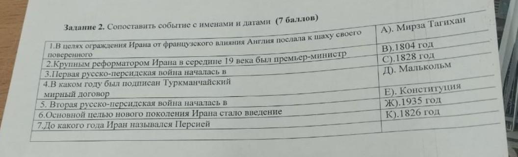 Задание 2. Сопоставить событие с именами и датами (7 баллов) 1.В целях ограждения Ирана от французского влияния Англия послала к шаху своего поверенного 2.Крупным реформатором Ирана в середине 19 века был премьер-министр 3.Первая русско-персидская война началась в 4.В каком году был подписан Туркманчайский мирный договор 5. Вторая русско-персидская война началась в 6.Основной целью нового поколения Ирана стало введение 7.До какого года Иран назывался Персией А). Мирза Тагихан В).1804 год С).1828 год Д). Малькольм E). Конституция ж).1935 год К).1826 год