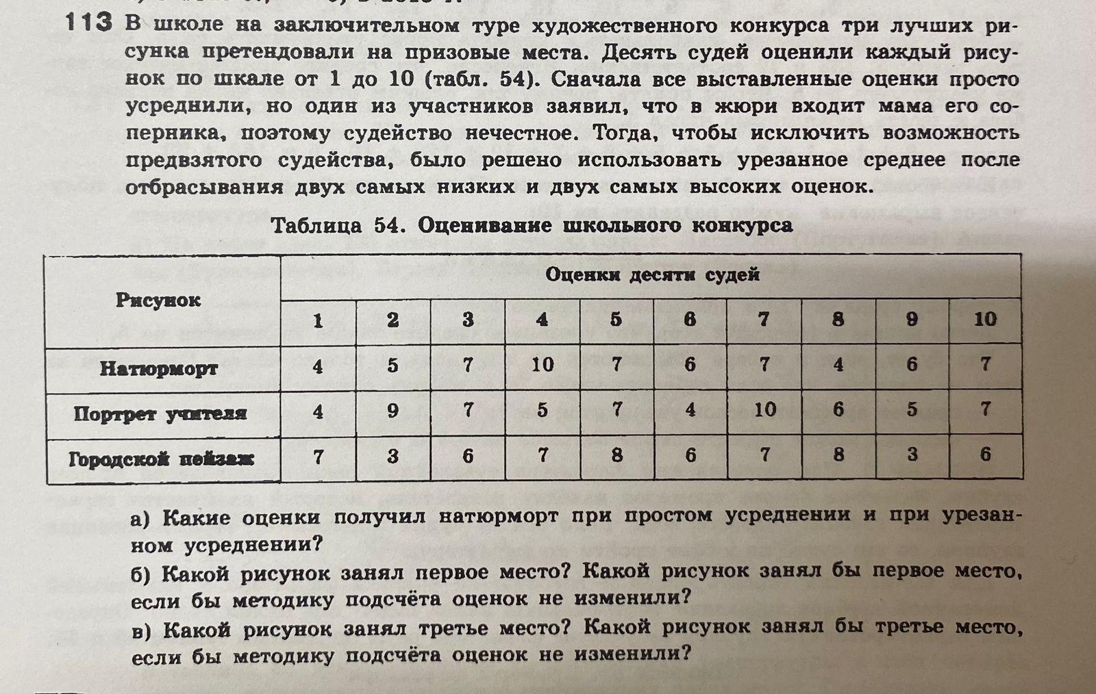 а) Натюрморт получил 6.3 при простом усреднении и 6.34 при урезанном усреднении.