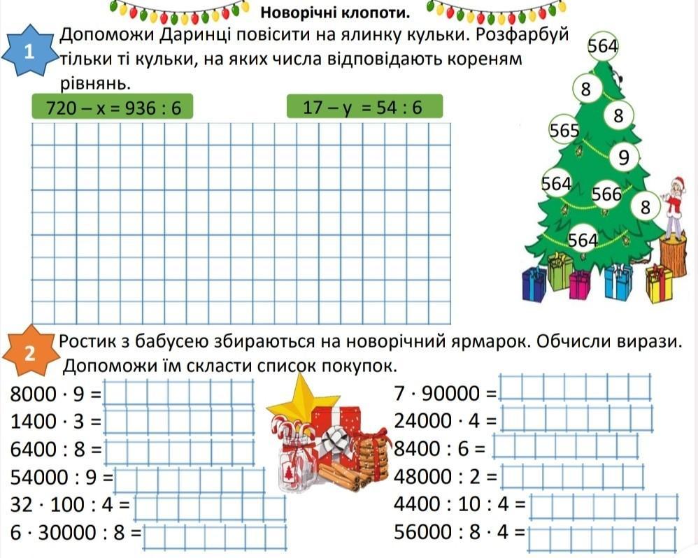 Ростик з бабусею збираються на новорічний ярмарок. Обчисли вирази. Допоможи їм скласти список покупок