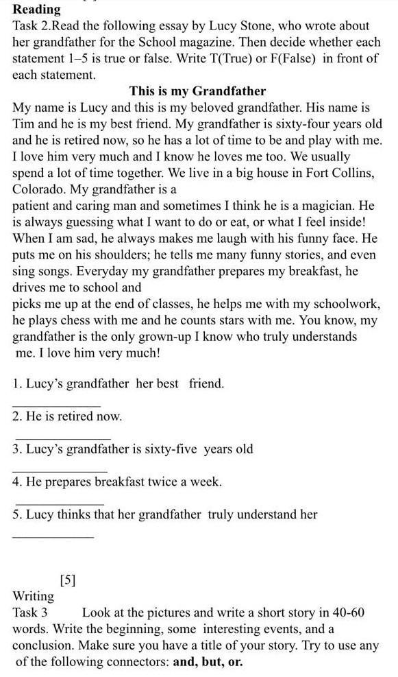 Reading Task 2. Read the following essay by Lucy Stone, who wrote about her grandfather for the School magazine. Then decide whether each statement 1-5 is true or false. Write T(True) or F(False) in front of each statement. This is my Grandfather My name is Lucy and this is my beloved grandfather. His name is Tim and he is my best friend. My grandfather is sixty-four years old and he is retired now, so he has a lot of time to be and play with me. I love him very much and I know he loves me too. We usually spend a lot of time together. We live in a big house in Fort Collins, Colorado. My grandfather is a patient and caring man and sometimes I think he is a magician. He is always guessing what I want to do or eat, or what I feel inside! When I am sad, he always makes me laugh with his funny face. He puts me on his shoulders; he tells me many funny stories, and even sing songs. Everyday my grandfather prepares my breakfast, he drives me to school and picks me up at the end of classes, he helps me with my schoolwork, he plays chess with me and he counts stars with me. You know, my grandfather is the only grown-up I know who truly understands me. I love him very much! 1. Lucy's grandfather her best friend. 2. He is retired now. 3. Lucy's grandfather is sixty-five years old 4. He prepares breakfast twice a week. 5. Lucy thinks that her grandfather truly understand her [5] Writing Task 3 Look at the pictures and write a short story in 40-60 words. Write the beginning, some interesting events, and a conclusion. Make sure you have a title of your story. Try to use any of the following connectors: and, but, or.