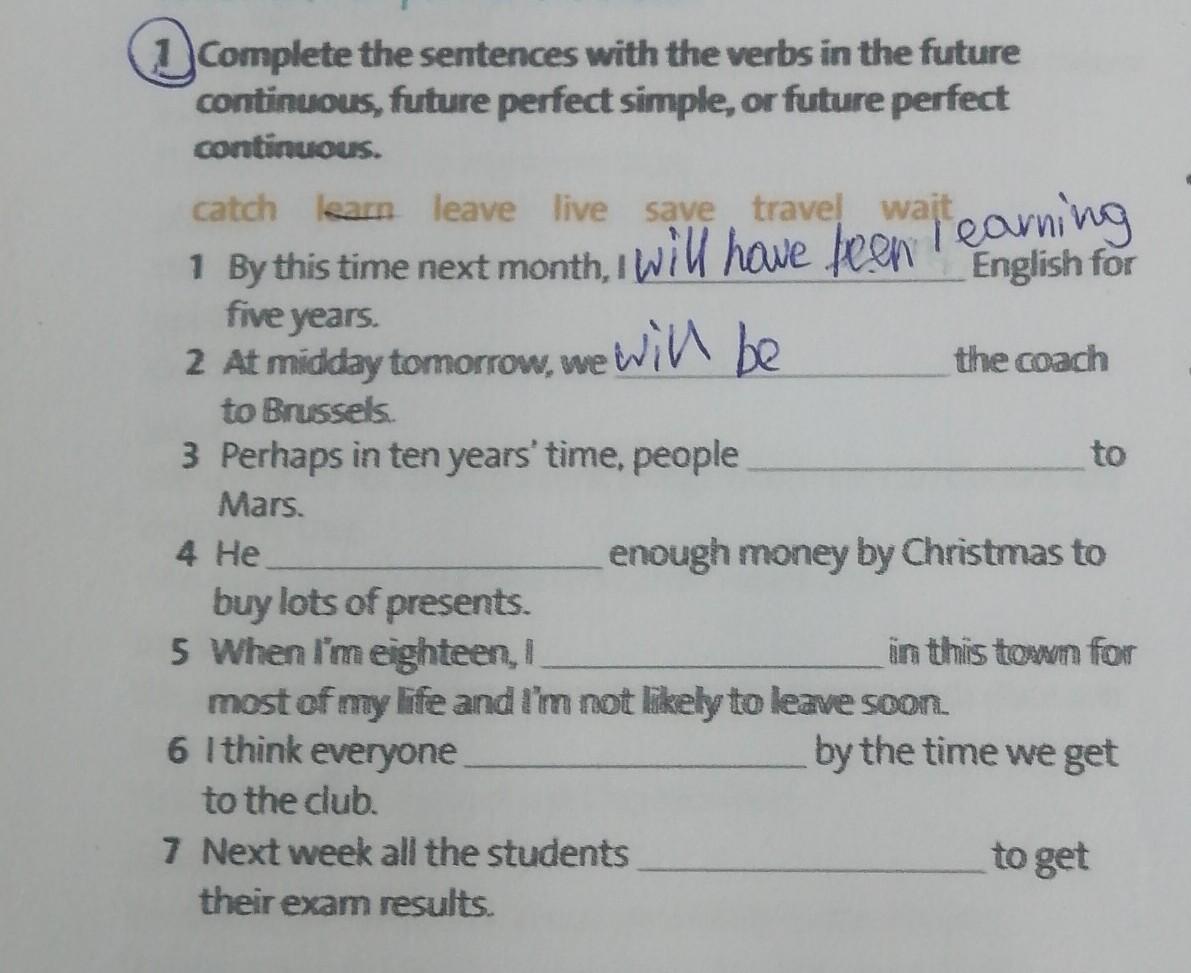 Complete the sentences with the verbs in the future continuous, future perfect simple, or future perfect continuous. catch learn leave live save travel wait 1 By this time next month, I will have been five years. 2 At midday tomorrow, we will be to Brussels. 3 Perhaps in ten years' time, people. Mars. 4 He waitearning English for the coach 7 Next week all the students their exam results. enough money by Christmas to buy lots of presents. 5 When I'm eighteen, I most of my life and I'm not likely to leave soon. 6 I think everyone to the club. to in this town for by the time we get to get their exam results.