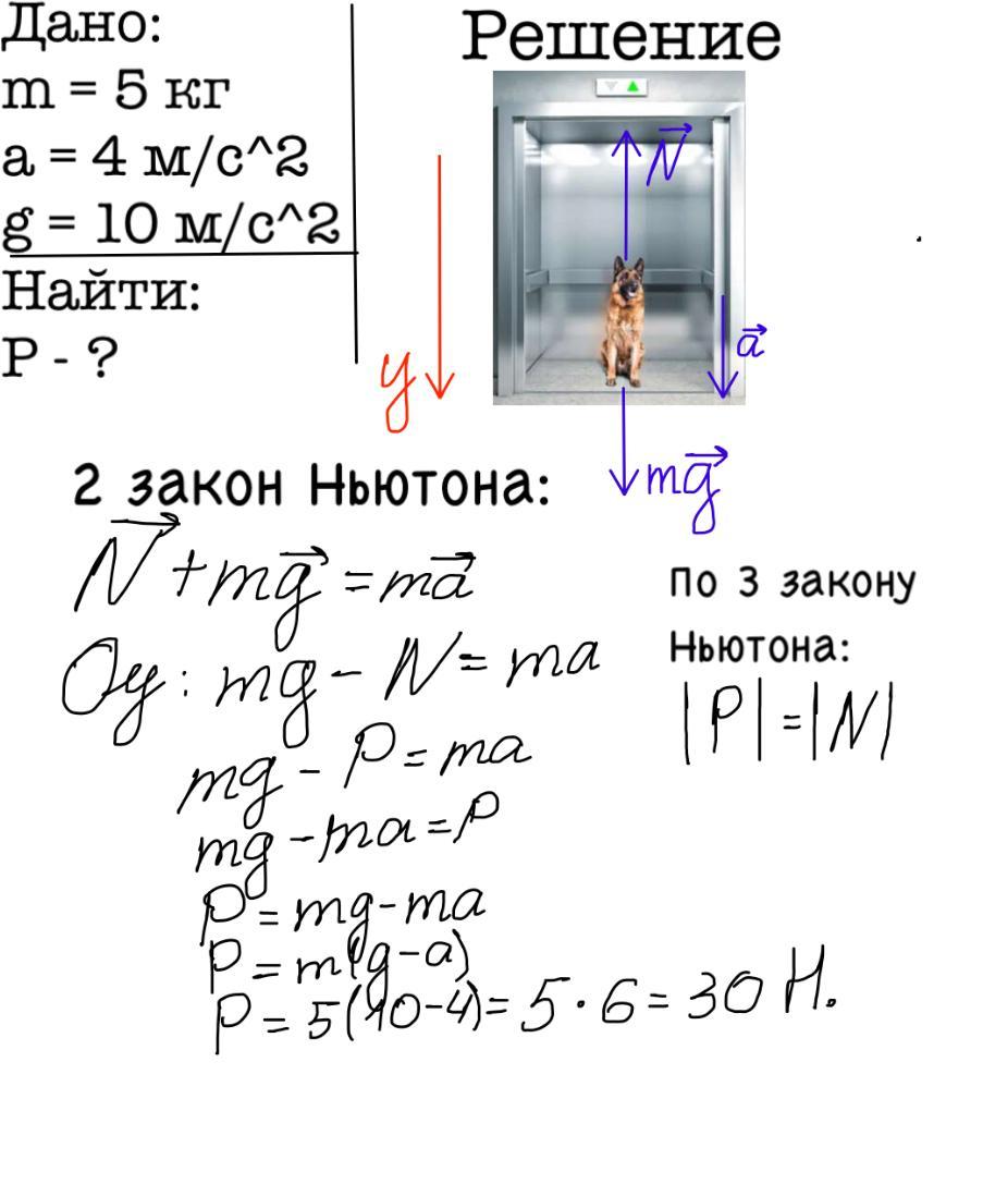 Маса мого собаки 5 кг. Він рухається вниз в ліфті з прискоренням 4м/с^2 Яка вага собаки в ліфті, якщо g=10 м/с^2.