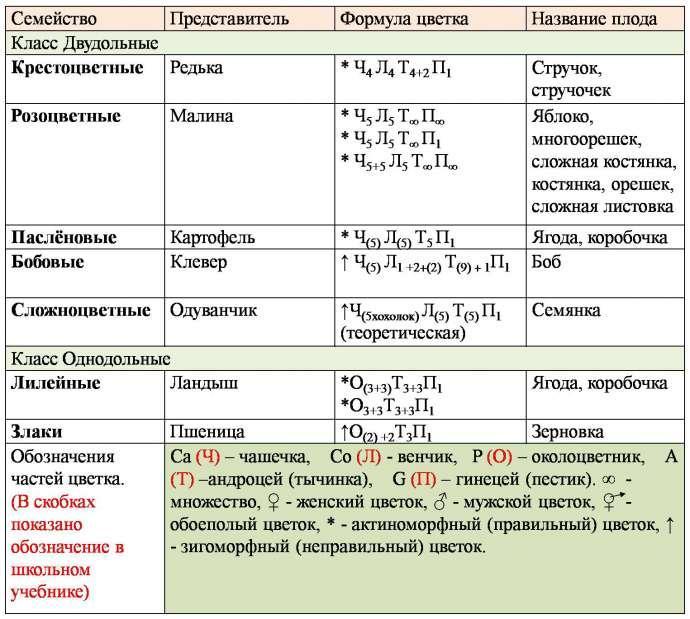 Ок — части простого околоцветника, Ч — чашелистки, Л — лепестки, Т — тычинки, П -пестики.