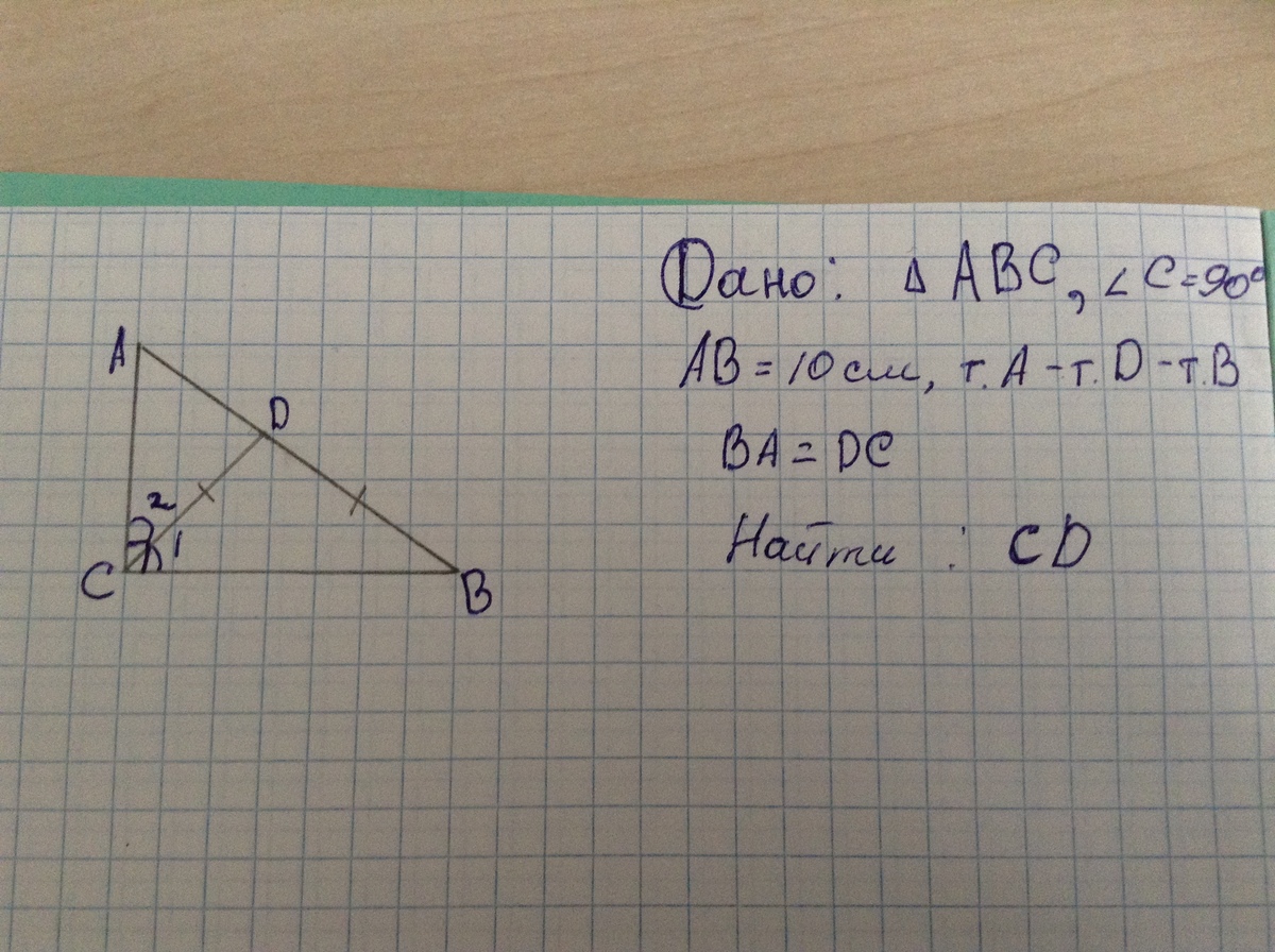 CD - ,биссектриса, значит угол 1=углу2=90:2=45 градусов. ΔCDB-равнобедренный с основанием СВ, поэтому угол DCB=углуDBC=45 градусов, тогда угол СDB = 180-(45+45)=90 градусов. ВΔСАD угол 1=45 градусов, угол СDA=90градусов, тогда угол САD=45 градусов, ΔСАD-равнобедренный с основанием АС, СD=DB=10:2=5