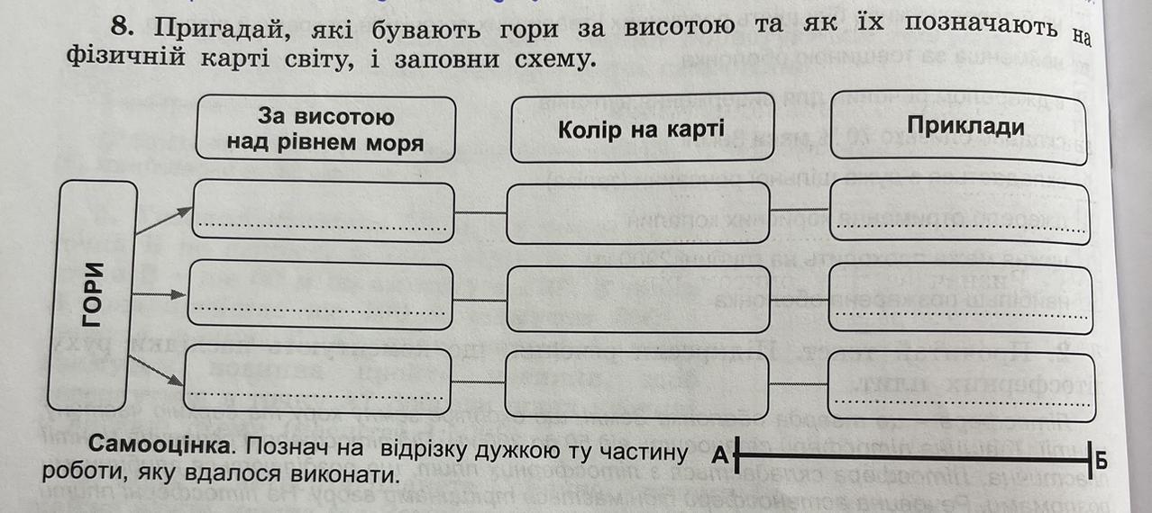 8. Пригадай, які бувають гори за висотою та як їх позначають