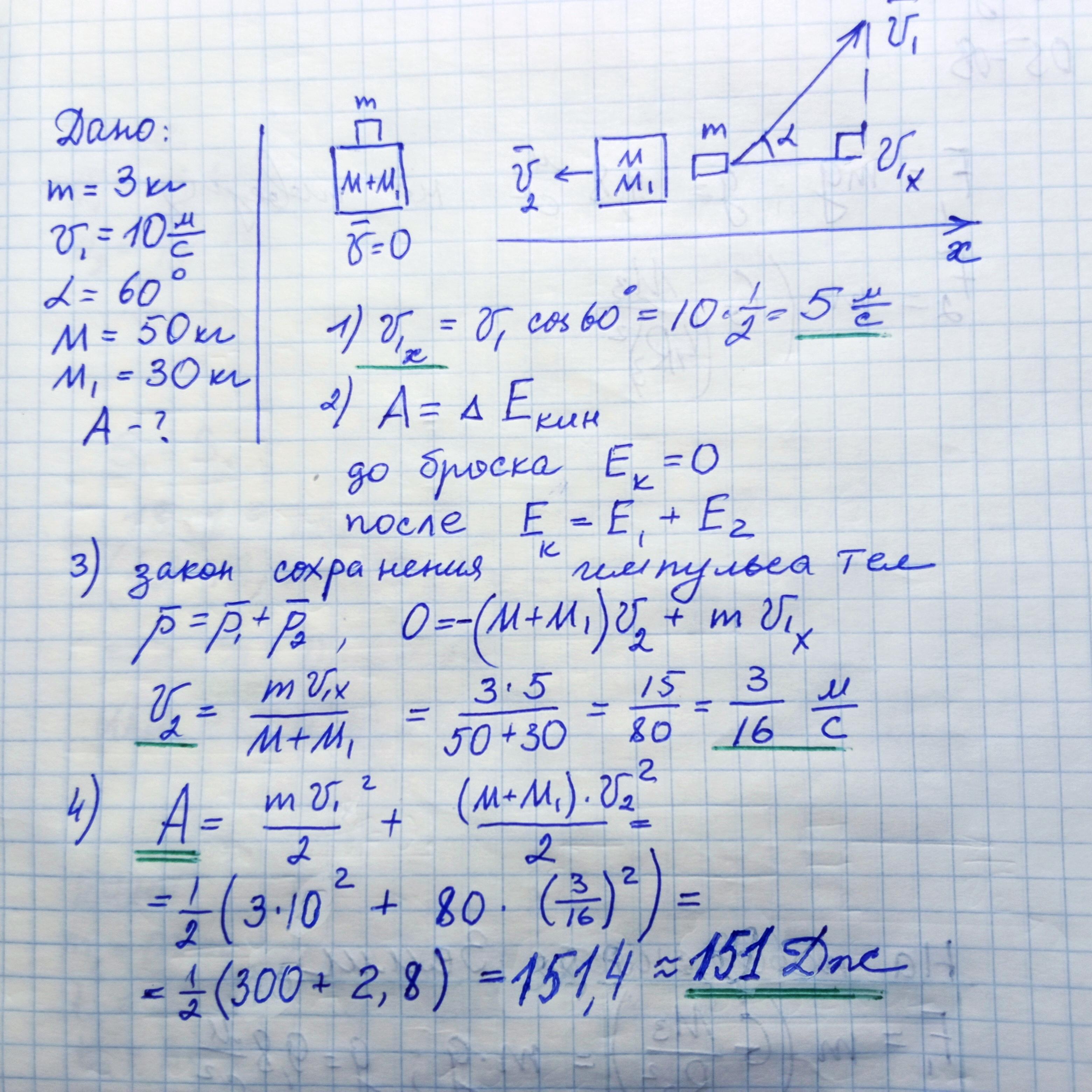 Человек стоит на неподвижной тележке и бросает горизонтально камень массой m = 3 кг со скоростью v₁ = 10 м/с относительно земли под углом к горизонту 60°. Определите, какую при этом человек совершает работу, если масса человека М = 50 кг, а масса тележки М₁ = 30 кг.