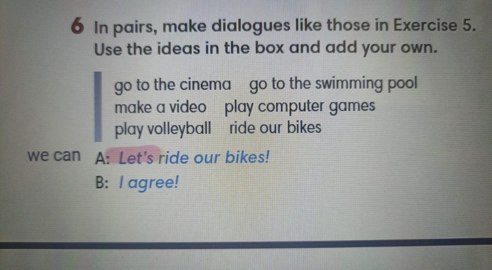 In pairs, make dialogues like those in Exercise 5. Use the ideas in the box and add your own. go to the cinema go to the swimming pool make a video play computer games play volleyball ride our bikes A: Let's ride our bikes! B: I agree!
