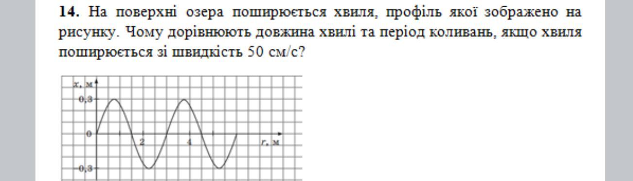 На поверхні озера поширюється хвиля, профіль якої зображено на рисунку. Чому дорівнюють довжина хвилі та період коливань, якщо хвиля поширюється зі швидкість 50 см/с?