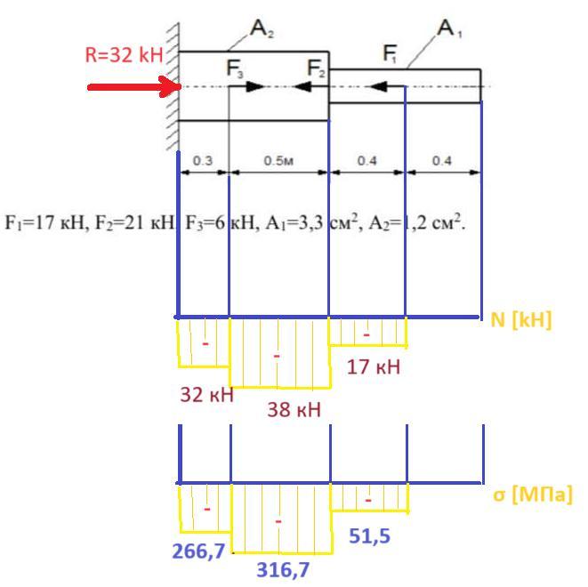 σ₂=N₂/A₂=38000/0,00012=316,7 МПа