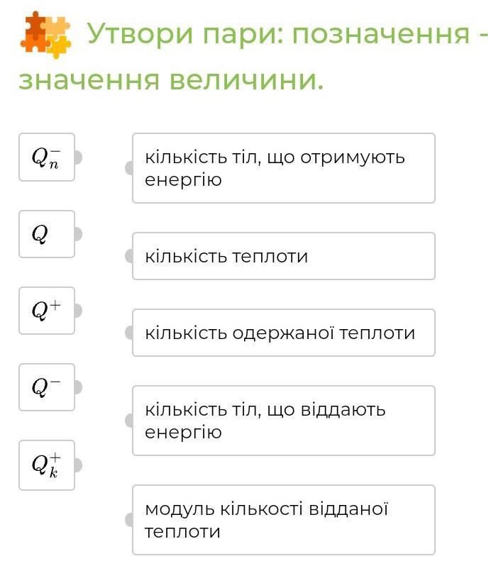 1. Утвори пари: позначення значення величини. Qn Q Q+ Q QF k кількість тіл, що отримують енергію кількість теплоти кількість одержаної теплоти кількість тіл, що віддають енергію модуль кількості відданої теплоти -