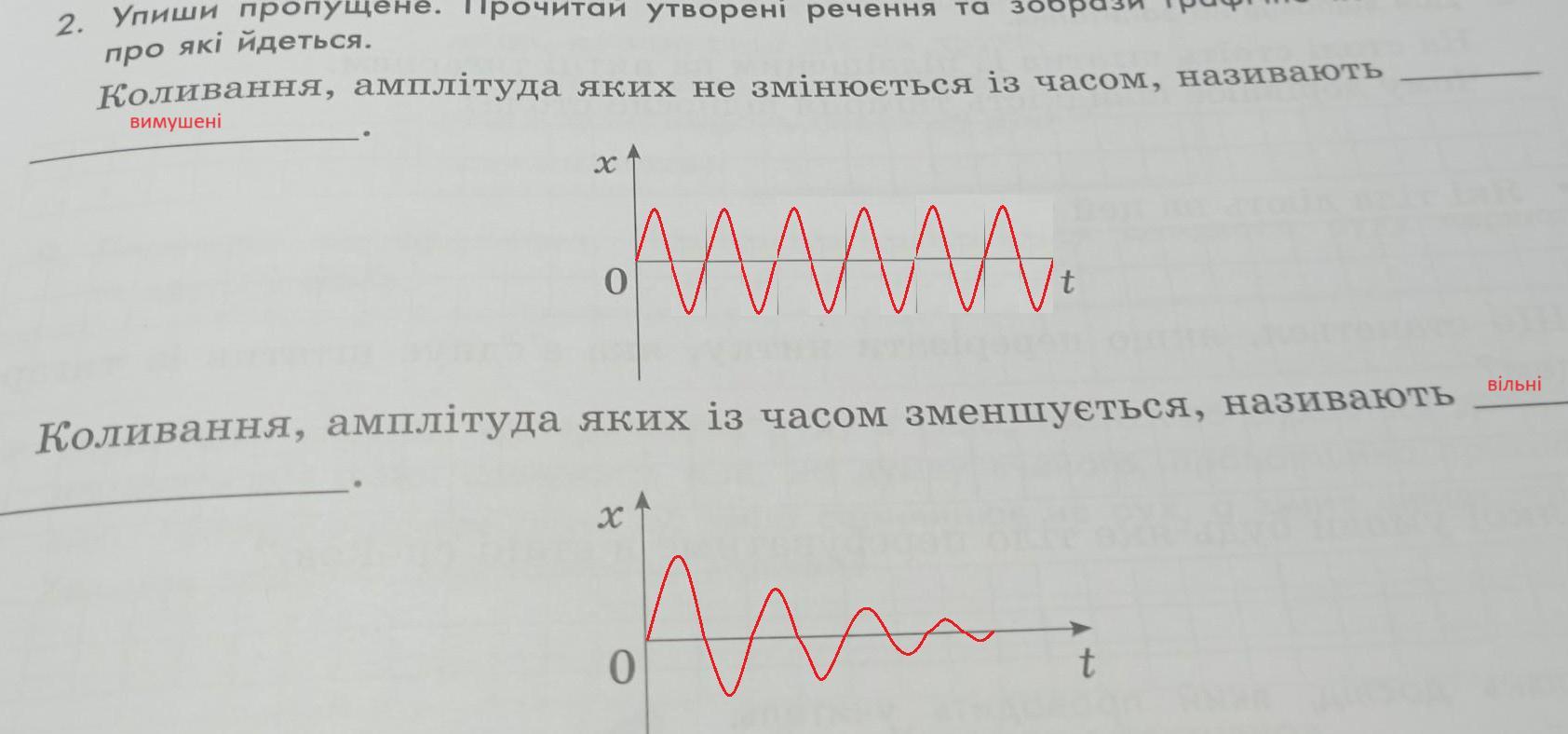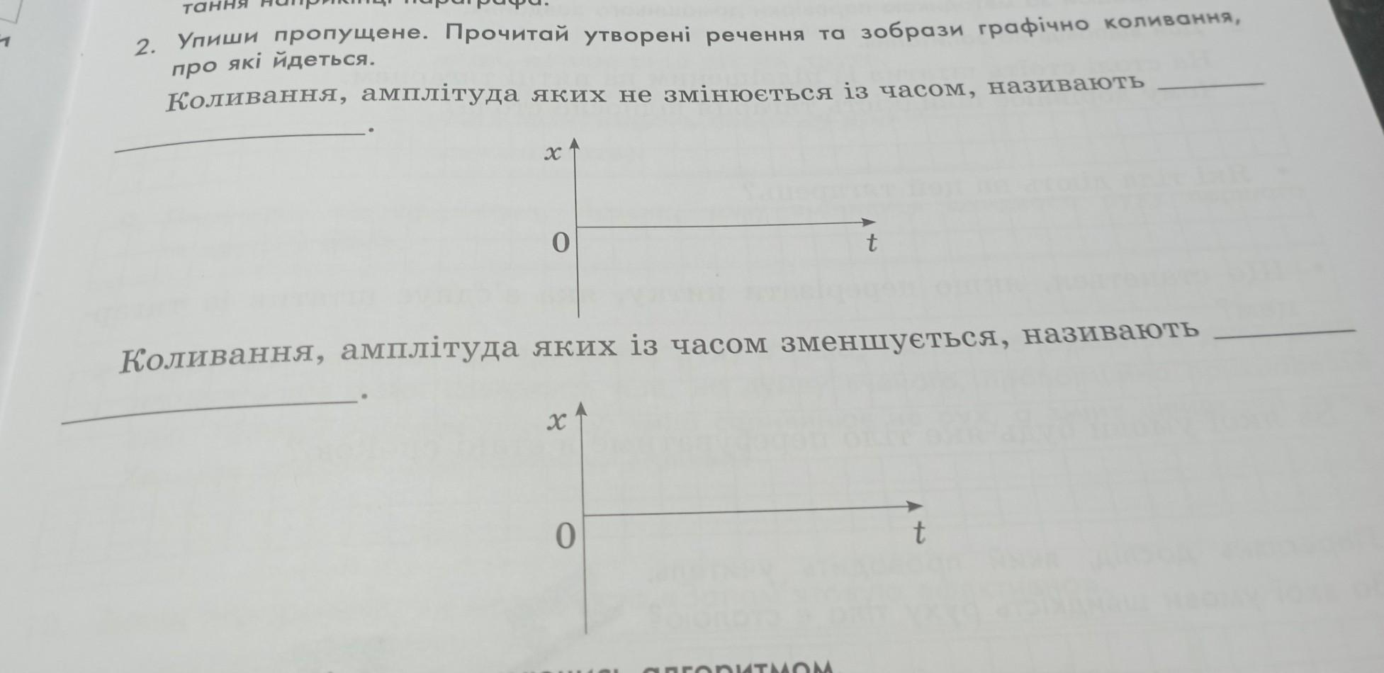 2. Упиши пропущене. Прочитай утворені речення та зобрази графічно коливання, про які йдеться. Коливання, амплітуда я яких не змінюється із часом, називають Коливання, амплітуда яких із часом зменшується, називають х t 0