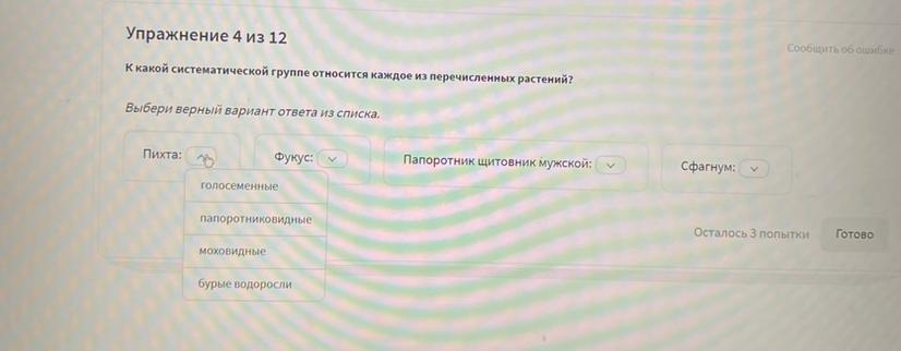 Пихта относится к группе хвойных деревьев, фукус — к водорослям, сфагнум — к мхам, а папоротник щитовник мужской — к папоротникам.