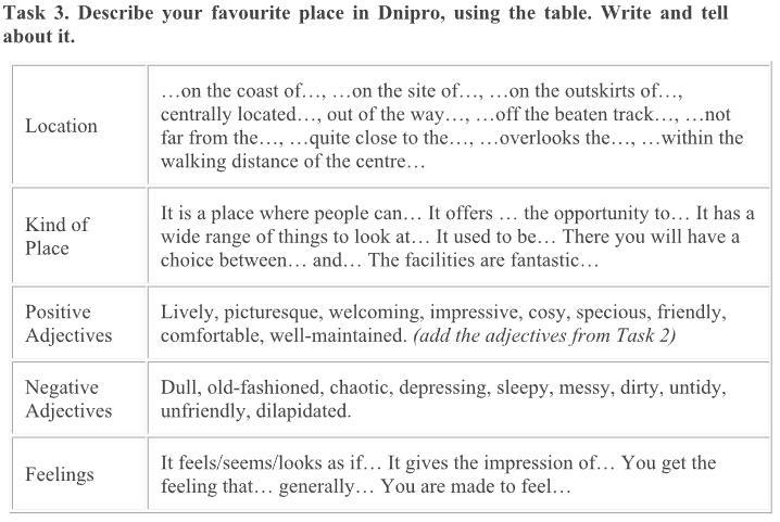 Task 3. Describe your favourite place in Dnipro, using the table. Write and tell