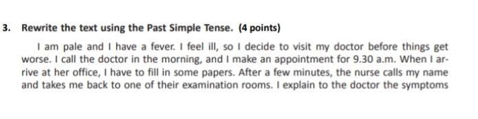 I was pale and had a fever. I felt ill, so I decided to visit my doctor before things got worse. I called the doctor in the morning and made an appointment for 9.30 a.m. When I arrived at her office, I had to fill in some papers. After a few minutes, the nurse called my name and took me back to one of their examination rooms. I explained to the doctor the symptoms.