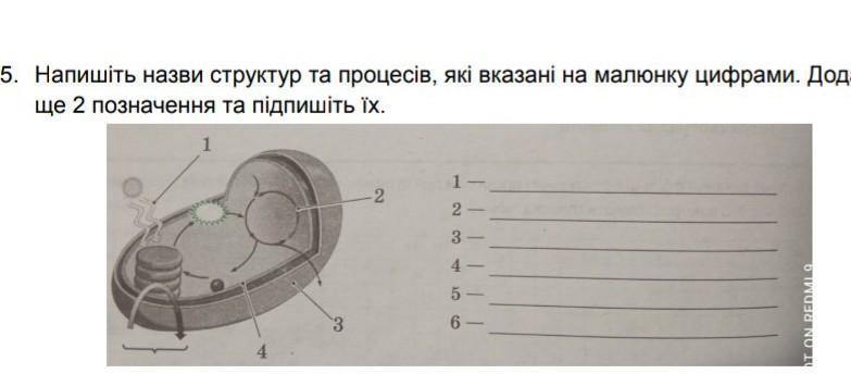 Напишіть назви структур та процесів, які вказані на малюнку цифрами. Додайте ще 2 позначення та підпишіть їх