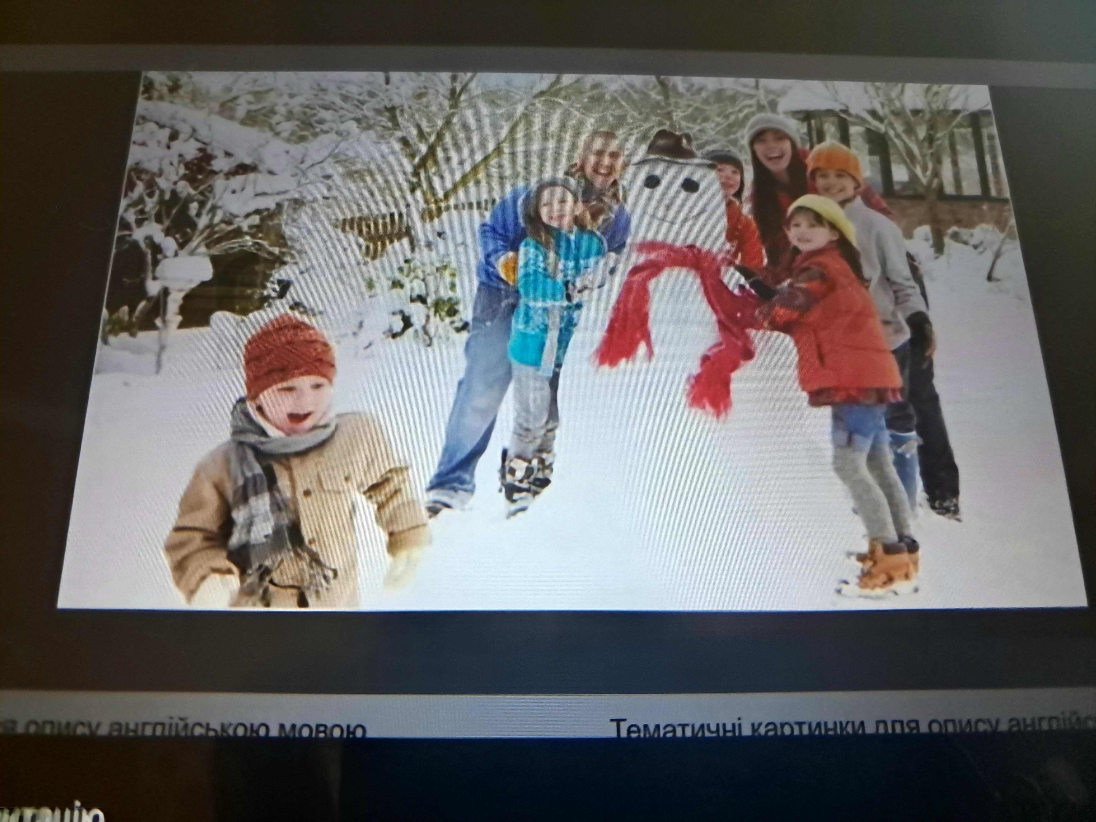 On the photo we can see a happy family. Mother and Father and most of their children are stay near the snowman. Snowman is dressed as all of them. But only with sciarpa and hat. Photo was made in garden full of trees. One child find some interesting thing and just walking out of the others.